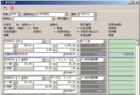 ![]() 株式の売買データを登録できます。株式の売買だけでなく、入金処理なども登録できます。 また画面イメージにあるように、米国など外国株式の売買データも登録が可能です。データ入力を軽減化するような機能が盛り込まれています。